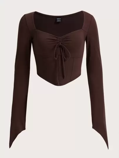 SHEIN EZwear 雞心領口前打結開衩袖短款T恤 - 巧克力棕 - 查看 1
