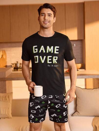 男士标语图案睡衣套装/睡衣套装 - 黑色 - 查看 1