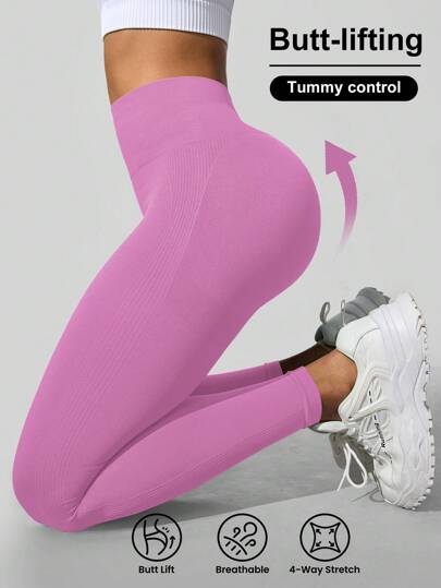 SHEIN Sovereign Charm 纯色简约休闲运动紧身无缝打底裤女士瑜伽裤 - 珊瑚粉 - 查看 1