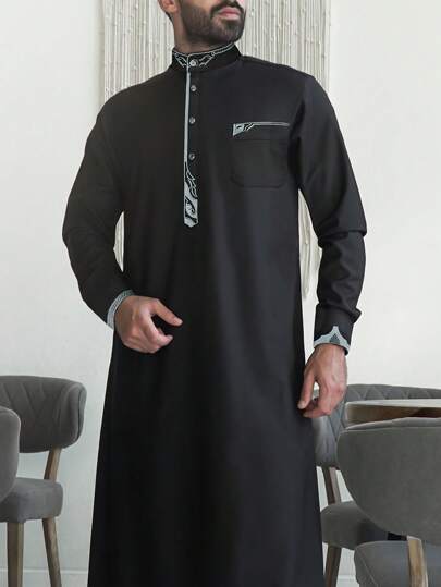 1 件男士优质涤纶面料休闲宽松中东风格长袍,舒适简约纯色长袖传统中东服装 - 黑色 - 查看 6