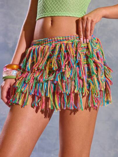 MUSERA 荷叶边针织多层迷你裙,夏季,伊比沙岛,Y2K,酷女孩,音乐节,锐舞派对,度假,夜店,可爱迈泰鸡尾酒,秋冬派对 - 彩色 - 查看 2