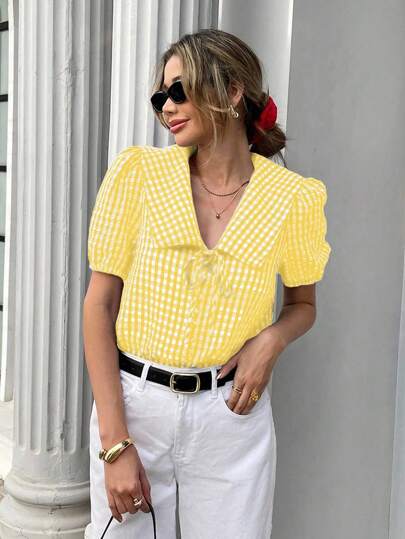 Chiquease 女士夏季休闲格子泡泡袖衬衫 - 黃色 - 查看 1