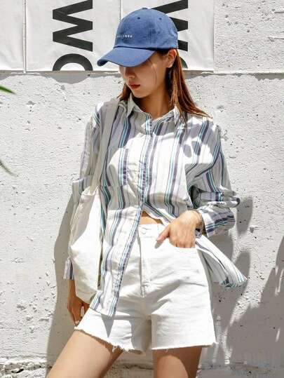 DAZY 条纹纽扣口袋前开襟衬衫,秋装长袖上衣 - 彩色 - 查看 1