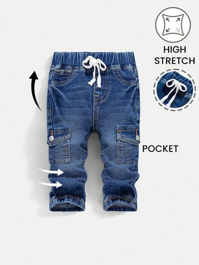 SHEIN 男婴春夏休闲柔软猫须水洗紧身蓝色牛仔工装裤带侧袋,婴儿春夏装春假装街头装 - 深色水洗藍 - 查看 1