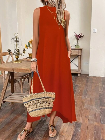 SHEIN LUNE 素色隱藏口袋背心連衣裙 - 鏽棕色 - 查看 1