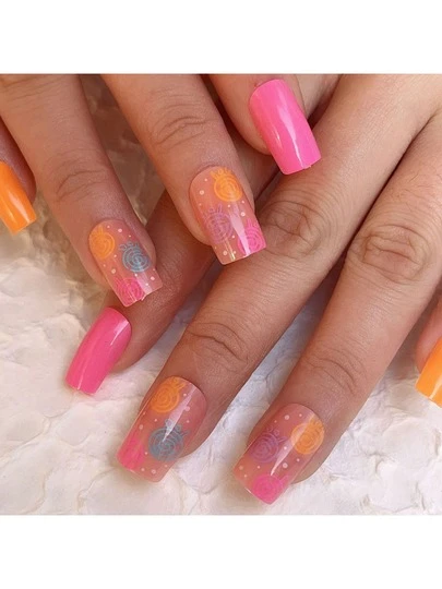 升级您的外观!24 件套欧式方形卡通线条经典百搭温和美甲套装,适合女士和女孩 Y2k - 彩色 - 查看 1