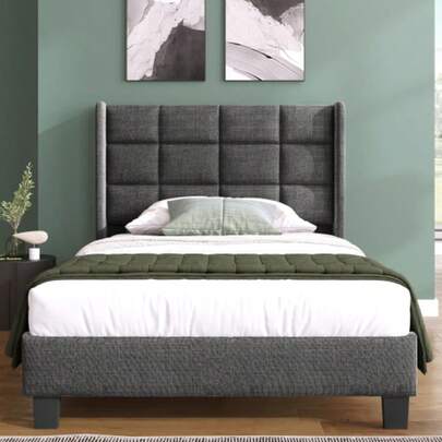 Upholstered Bed With A Modern Design And Padded Headboard. Single Slatted Bed, 90 X 200 Cm, In Grey Linen, Medium Firmness (Mattress Not Included). - 灰色 + 亞麻布 + 90公分*200厘米 - 查看 1