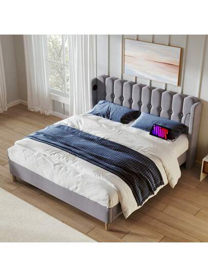 Upholstered Double Bed With USB Type-C Charging Function, Bed Frame With Slatted Base, Upholstered Bed In Grey, 180 X 200 Cm Bed Frame, Youth Bed For Bedroom/Guest Room - Linen Material - 灰色 - 查看 1