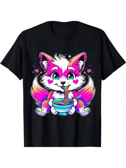 Transgender Pride Kawaii Fox Ramen Noodles Trans Flag T-Shirt  Women Clothing  Tops  Kawaii Clothes  Camisetas - 黑色 - 查看 1