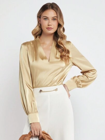 BizChic V領素色緞面上衣工作服 - 香檳色 - 查看 1