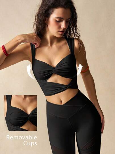 VARSIVA 女士纯色扭结镂空短款运动背心,夏季运动文胸 - 黑色 - 查看 1