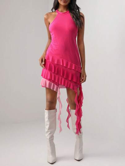 VERO DIAZ 素色不對稱下擺掛脖洋裝 - 玫紅色 - 查看 1