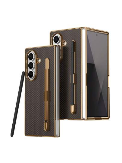 VIETAO 电镀设计内置笔手机壳,兼容三星 Galaxy Z Fold 7 6 5 4,碳纤维纹理手机壳 - 棕色 - 查看 1