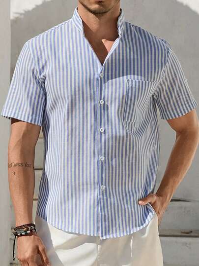 VIVINTIMO 男士条纹印花贴袋前扣休闲短袖衬衫