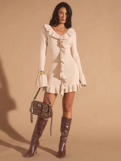 Glamine 女士纯色荷叶边领喇叭袖针织连衣裙,秋季时尚 - 杏色 - 查看 1