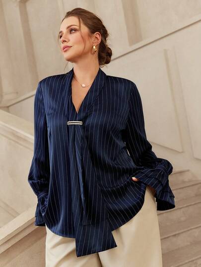 VOLUPTÉ CURVE 大码春夏条纹时尚简约优雅金属衬衫女式上衣 优雅女式衬衫 优雅女式上衣和衬衫 经典女式工作上衣 蓝色条纹商务衬衫 2026流行商务衬衫 毕业衬衫 高雅商务衬衫