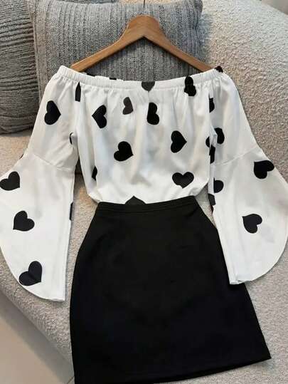 女士度假穿搭,女士夏季穿搭,时尚百搭优雅露肩长袖日常上衣 - 黑與白 - 查看 1