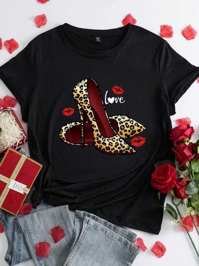 SHEIN LUNE 情人节豹纹心形图案高跟大码短袖 T 恤 - 黑色 - 查看 1
