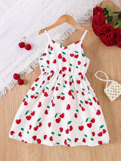 适合年轻女孩的情人节心形和樱桃印花吊带 V 领连衣裙 - 白色 - 查看 1