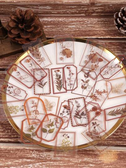 1 包/30 件复古透明植物和花卉图案贴纸,带邮票框,宠物装饰标签,适用于 DIY 日记回到学校 - 彩色 - 查看 1