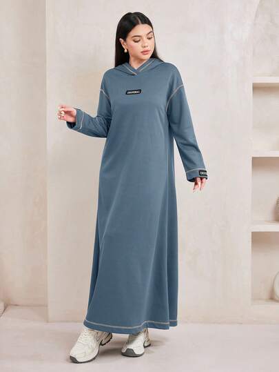 Veilorie 连帽撞色缝线字母图案长款卫衣连衣裙 - 藍色 - 查看 1