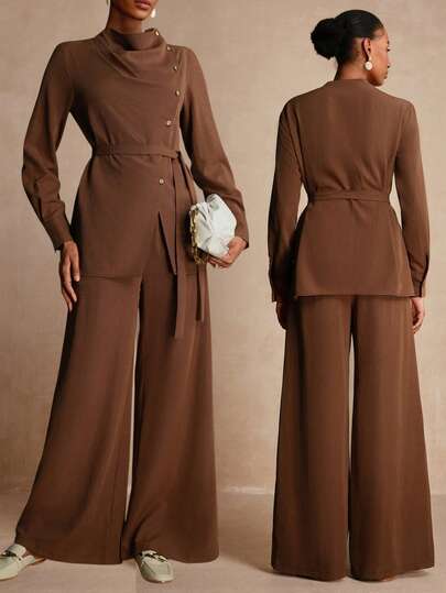 Vesra 不对称翻领系带衬衫,优雅复古风格,宽松版型,简约优质上衣和女式裤子套装 - 棕色 - 查看 1