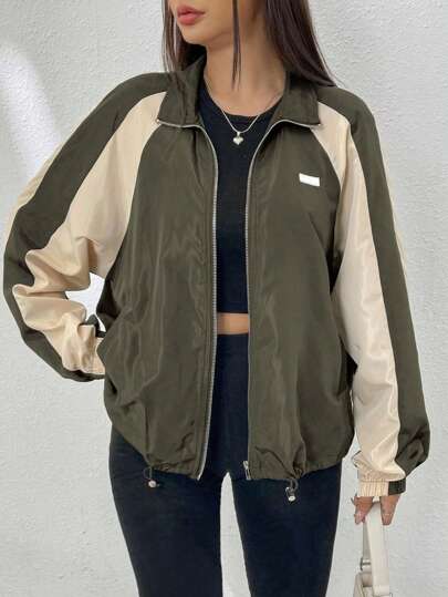 SHEIN EZwear 秋冬季撞色拼接插肩袖抽绳下摆拉链外套 - 軍綠色 - 查看 1