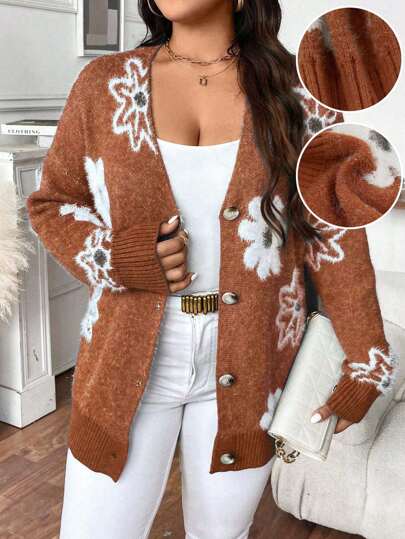 Calvaya 大码休闲花卉图案前扣开衫,适合秋冬季 - 鏽棕色 - 查看 1
