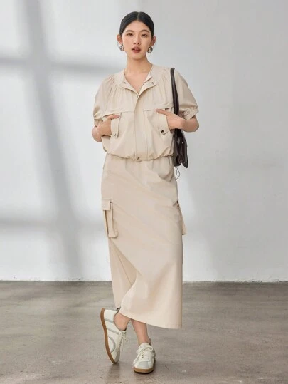 Dazy-Less 2 件套女士宽松休闲实用风格大口袋花卉荷叶边设计套装夏季复古风格商务休闲女装、教师装 - 杏色 - 查看 2