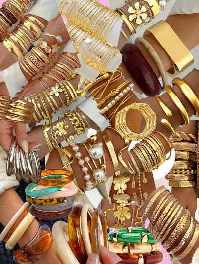 复古优雅硬币风格随机32/25/24/19/12/5/3件金属树脂多元素几何不对称镂空线条缠绕花朵雕刻纹理宽手镯套装,个性化豹纹扎染彩色树脂手镯,男女皆宜,是节日、派对、约会、送礼、日常搭配、新年、情人节的理想之选(款式随机) - 彩色 - 查看 21