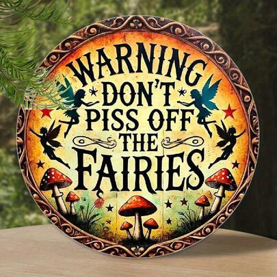 [复古仙女标志] 质朴的 8x8 英寸复古仙女警告标志墙面艺术装饰 | 耐用的户外装饰,适合花园或家居,带有异想天开的仙女和蘑菇设计,易于悬挂,制作精良