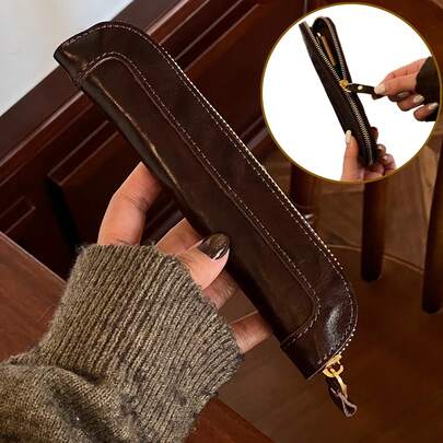 复古全粒面皮革铅笔盒,手工制作多功能收纳袋,简约手拿包,纤薄拉链设计,可装钢笔、圆珠笔和铅笔,简约风格男女通用日常携带收纳包