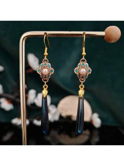 复古新中式风格吊坠耳环,长款垂坠设计,适合夏季派对假日日常佩戴 - 紋菀含珠 - 查看 1