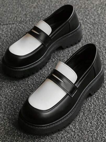 复古圆头厚底男士正装鞋系带增高正装鞋男士派对时尚英伦风格低帮黑白休闲皮鞋 - 黑與白 - 查看 1