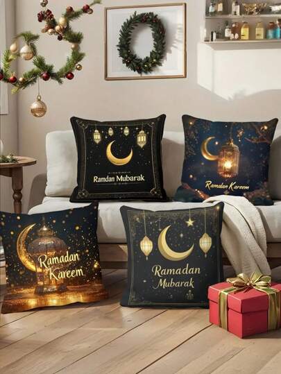 复古风格斋月吉祥涤纶枕套 4 件套,可机洗,装饰性拉链抱枕套,带有华丽图案,适用于家居装饰、沙发和卧室 - 多功能编织靠垫套(不含枕芯) - 彩色 - 查看 1