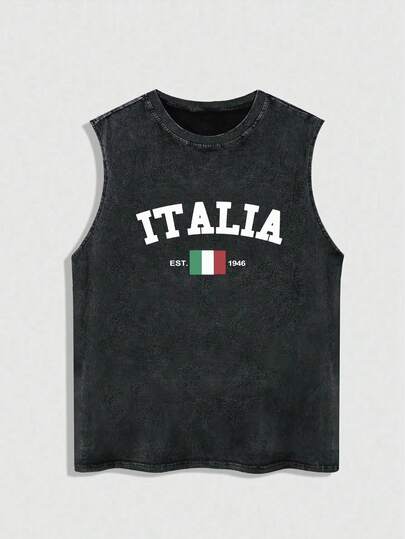 复古水洗男士休闲无袖背心,简约意大利国旗印花,适合春夏季日常穿着 - 黑色 - 查看 1