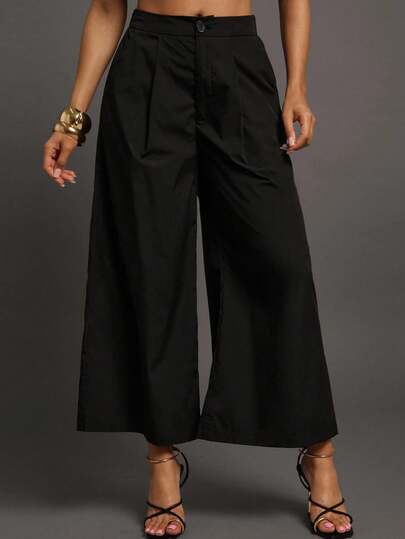 Vixey 纯色梭织褶裥斜插口袋阔腿七分裤,商务休闲,办公 - 黑色 - 查看 1