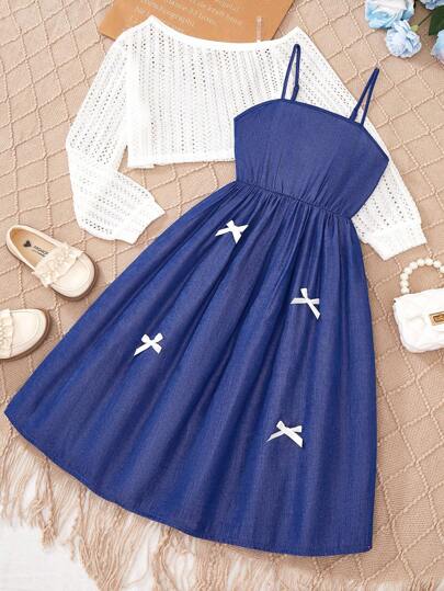 SHEIN 女式宽松针织冰丝罩衫,镂空长袖网眼披肩,百搭蝴蝶结仿牛仔吊带背心连衣裙套装,春夏秋 - 彩色 - 查看 1