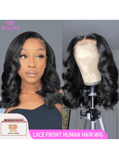 WALSDI 200% 密度 13x4 13x6 4x4 5x5 无胶短波浪鲍勃假发混合人发混合头发预拔自然色戴上即走假发预剪蕾丝 14 英寸波浪短鲍勃蕾丝前假发混合人发混合纤维女士无胶时代到耳蕾丝前假发 - 自然色&黑色系 - 查看 1