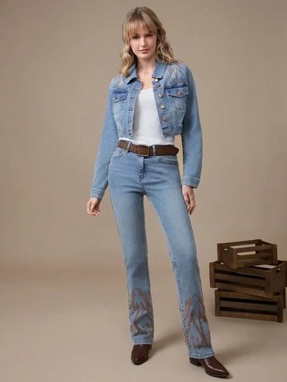 WESTFADE 优质牛仔棉质领口纽扣前西部刺绣短款卡车司机夹克纳什维尔风格服装 - 淺色水洗藍 - 查看 1