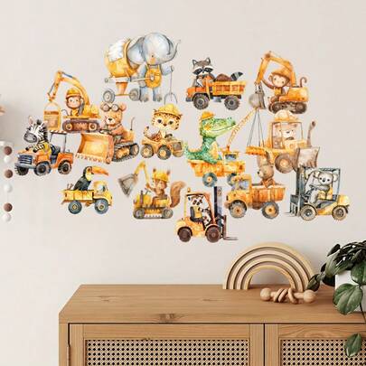 水彩工程车辆卡车动物墙贴,包括挖掘机、装载机、推土机、狮子和大象,适用于游戏室、客厅、卧室等家居墙面装饰。 - 建築汽車 - 查看 10