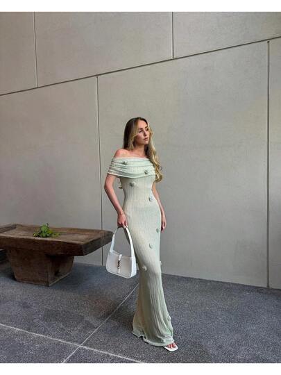 3D Floral Off Shoulder Dress Woman Strapless Pleated Solid Color Robes Sleeveless Elegant Fashion Slim Women's Long Maxi Dress - 綠色 - 查看 1