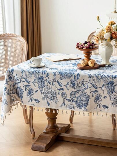 1 件蓝色花卉流苏桌布,复古风格,带流苏,涤纶纤维材质,可水洗,适用于床头柜、餐桌、咖啡桌、沙发套、农舍家居、家庭用餐、厨房、晚餐、派对、感恩节、秋季装饰、四季装饰 - 藍色 - 查看 1