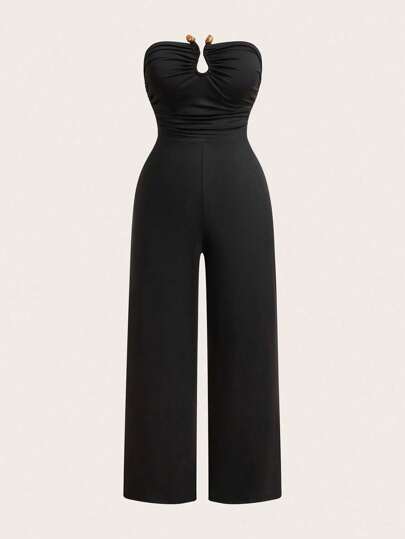 Sweetra 女式加大码无袖纯色休闲修身简约连体裤 - 黑色 - 查看 1