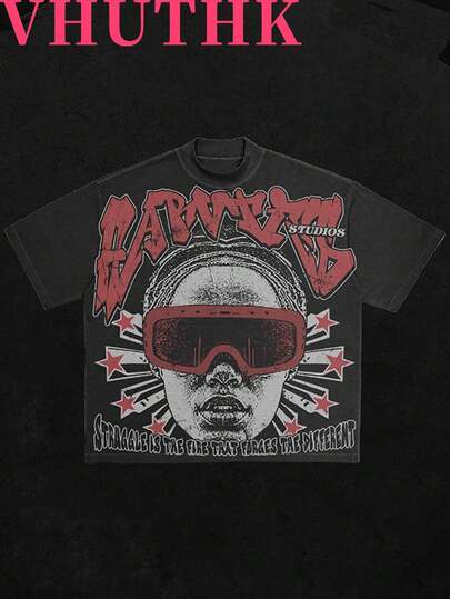 VHUTHK (180 Cotton T-Shirt) Letter "FOSSRICH" And Portrait Print Men's Summer Round Neck Short Sleeved Casual Cotton Print - 黑2 - 查看 5
