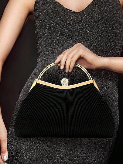 褶饰水钻晚宴手拿包,黑色小礼服派对钱包,时尚公主手提包,适合婚礼、宴会、KTV,适合作为母亲的礼物 - 黑色 - 查看 1