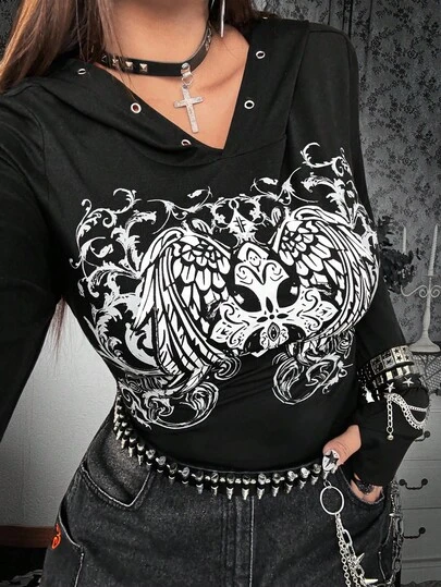 Whyspr 图案印花连帽金属孔眼长袖修身深色大码女式T恤