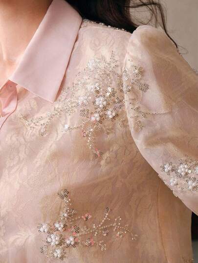 Anewsta 法式百搭长袖女式衬衫,奢华串珠亮片装饰休闲上衣 - 粉色 - 查看 1