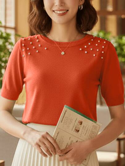Women's Knit Blouse Short Sleeve Pearl Details Basic Casual Marrie Tricot