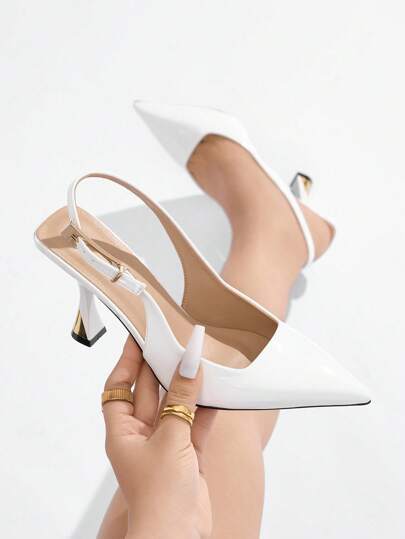 女士尖头闭趾金属扣装饰纯色高跟鞋,舒适易穿,适合工作、通勤和日常穿着,秋冬季节适用,白色亮面,优雅